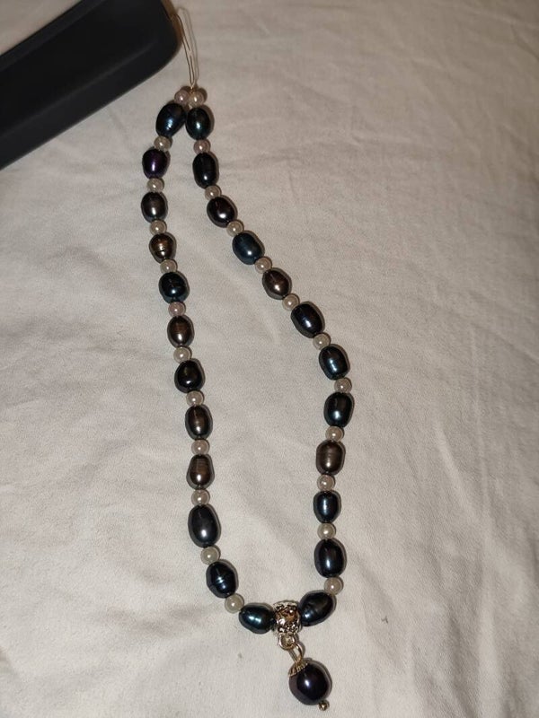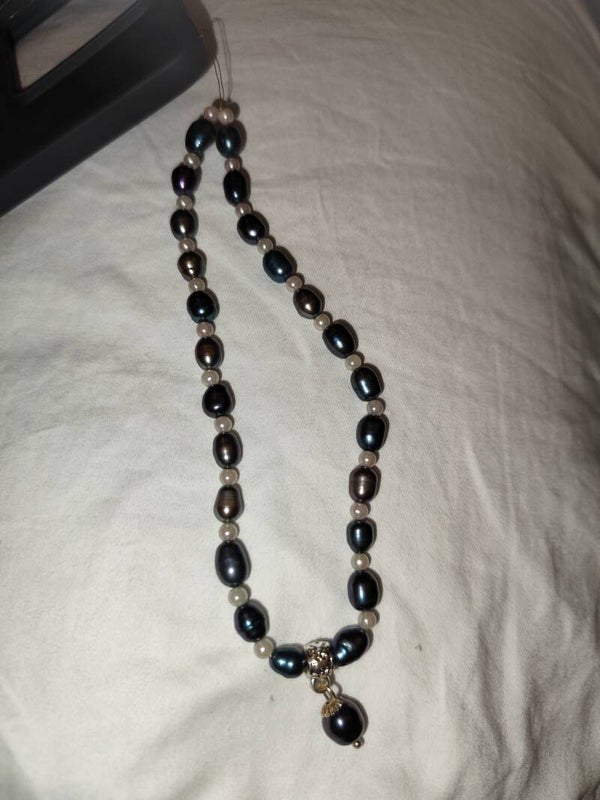 Bijoux de portable en perles d'eau douce noires bleutées naturelles. Perles d'espacement en acrylique. Monté sur fils de laiton.